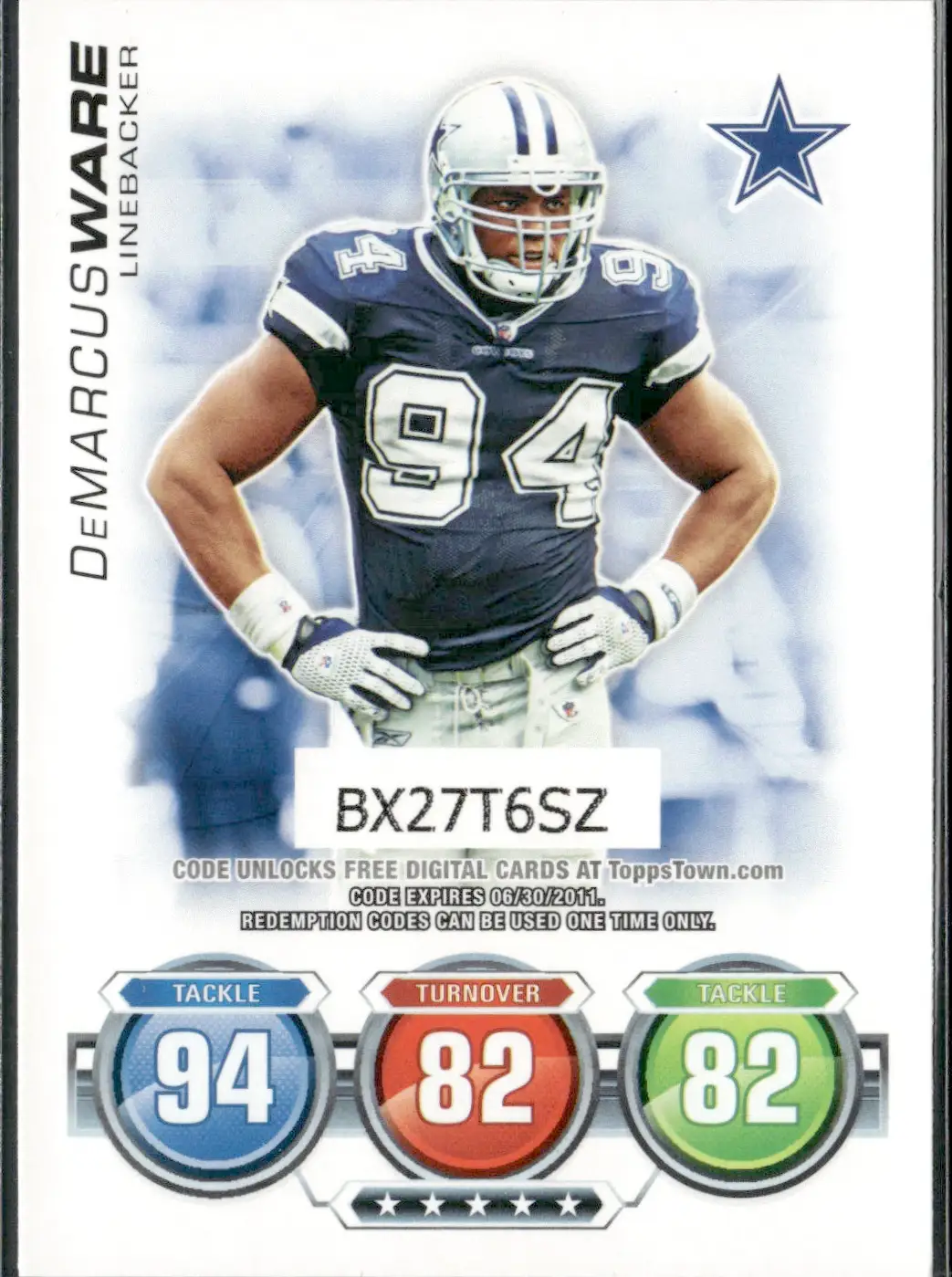 Topps Attax 2010 | #NNO DeMarcus Ware – Dallas Cowboys | Code Card